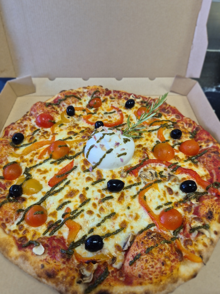 champignons, poivrons, fromage, à la sortie du four : tomate cerise, olives mozzarella di bufala, pesto